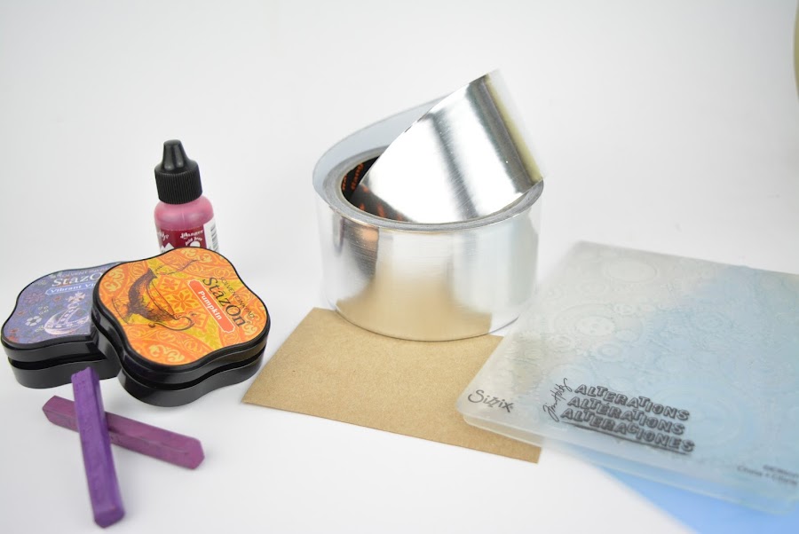 En la foto os enseño todo lo que yo he usado para hacer esas dos placas, pero lo realmente necesario es una cartulina gruesa, puede ser de cualquier color, y cinta de aluminio que se compra en ferreterías. Es una cinta como la americana, solo que en vez de ser de plástico es de aluminio y su uso original es para proteger superficies de altas temperaturas. Los demás materiales es ya para trabajar los acabados.