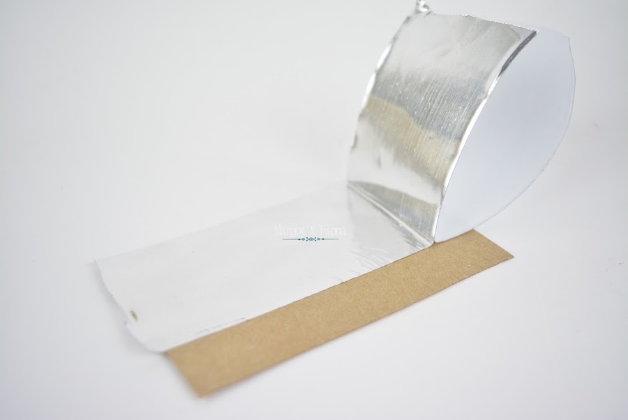 Comenzamos cortando el trozo de cartón que vamos a necesitar. Cortamos un trozo de cinta de aluminio, le quitamos el papel protector y lo pegamos en la cartulina, con mucho cuidado que no se formen arrugas.