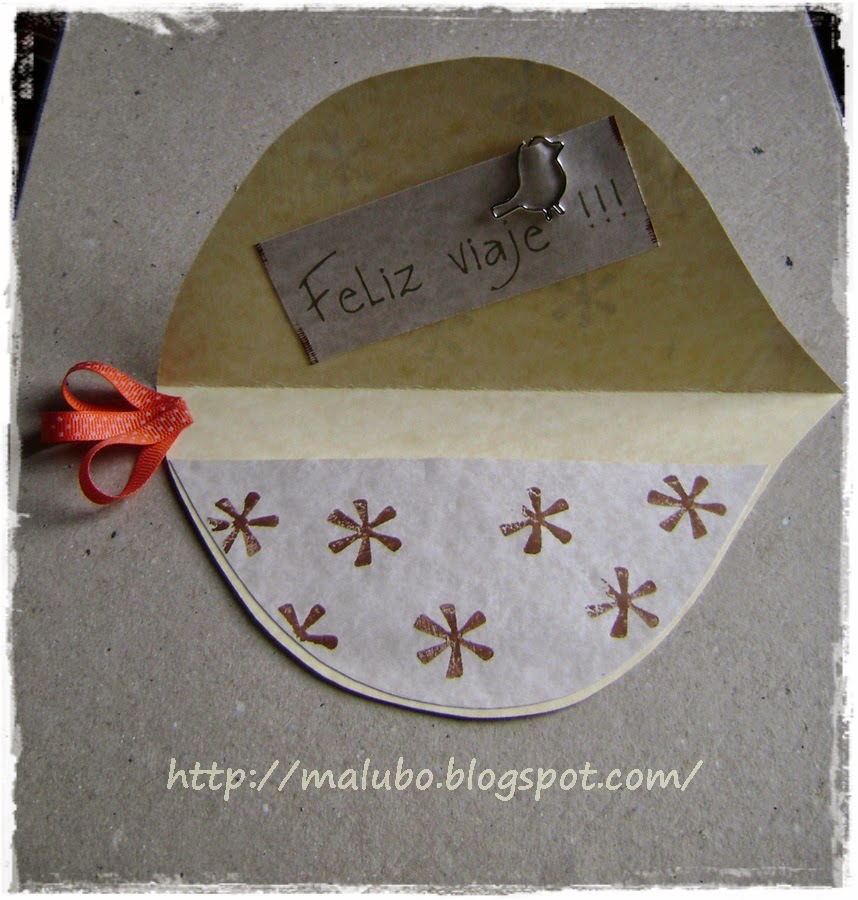 Y aquí otro intento scrappero,jaja. Esta tarjeta se la hice a una sobrina para uno de esos regalito$$$$$ que a veces damos. No se la entregué en persona pero fue muy grato cuando hablamos por teléfono oírle decir que le encantó la tarjeta, que si la había hecho yo!!! jaja. Me gustó mucho como quedó, y el tema... los pájaros que tanto me gustan, pero hay que ser muy realista no tengo la experiencia y las herramientas suficientes para esta técnica y eso se nota, jaja, sobre todo en el interior, viendo ahora la foto pienso que en el bolsillo hubiera quedado mejor si le hubiese puesto una cinta. Para el letrero de feliz viaje intenté envejecerlo con la tinta pero no salió y ya no tenía tiempo por eso quedó así, eso lo tengo que practicar y mucho,jaja.