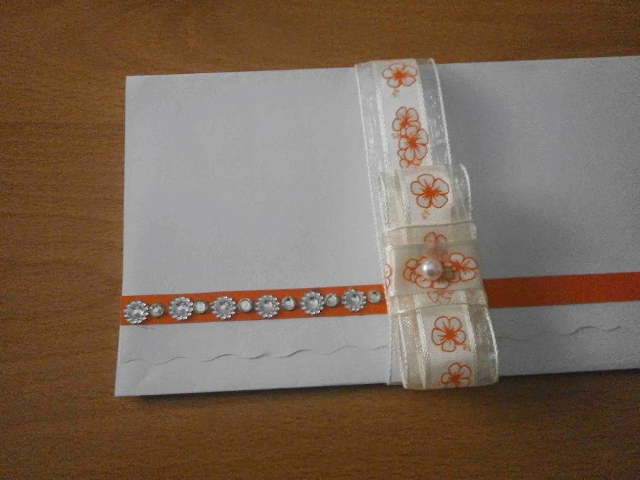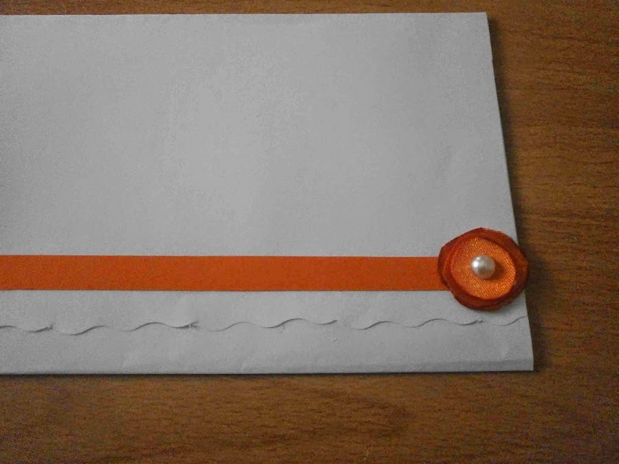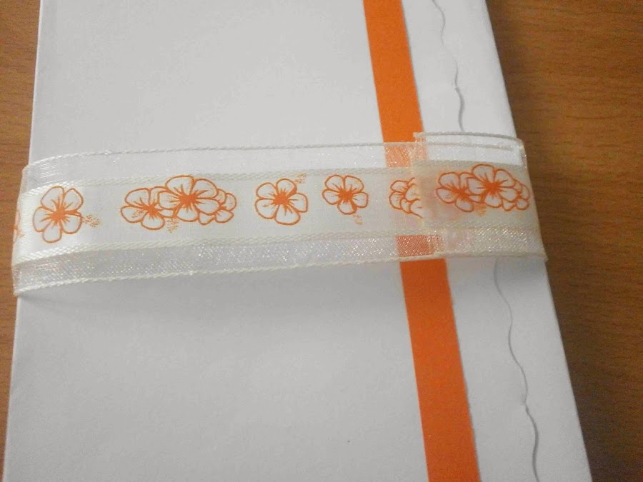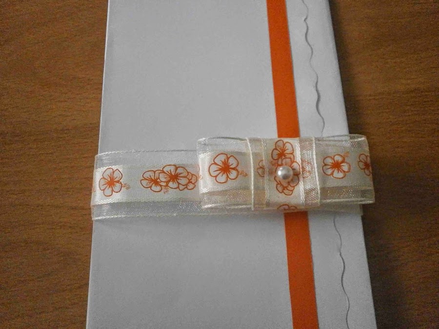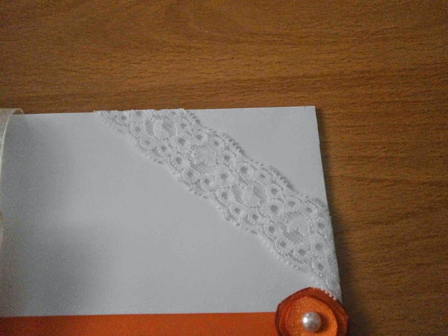 Alrededor de la tarjeta pase cinta de organza y le pegué los extremos.