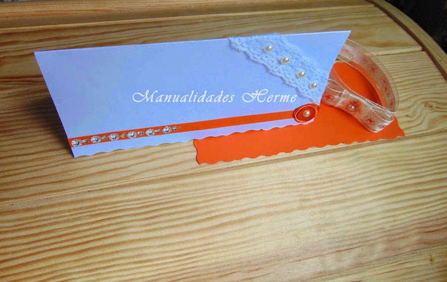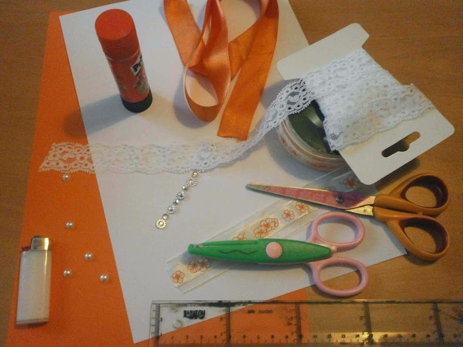 Materiales: Cartulina blanca, cartulina de color, pegamento de barra, puntilla, lazo de raso, lazo de organza, un mechero, regla, tijeras, tijeras de corte redondo, stras adhesivo, perlitas y silicona.