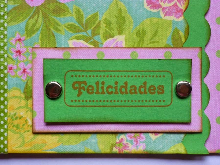 Me apetecía hacer una tarjeta con colores alegres y frescos, así que utilicé papeles de K&Company que iban perfectamente con mi idea. Y aproveche para usar mi nuevo sello de "Felicidades". No soy muy dada a los sellos, pero creo que uno así tiene que estar en el fondo de armario de cualquiera que haga scrap. Se puede poner "felicidades" en una tarjeta de cumpleaños, de Navidad, de boda, de bautizo, para celebrar una buena noticia, en fin, para todo. El primero que adquirí así, hace mucho tiempo, lo he amortizado de sobra.