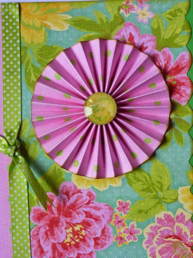 Con una troqueladora de bordes de Papermanía con forma de ondas troquelé los laterales de los papeles que puse sobre una cartulina verde. Y como adornos, un lazo en vertical, un rosetón de papel que lleva en el centro un pebble casero, y el letrero con el sello. Todos los papeles están entintados con Distress Peeled Paint.