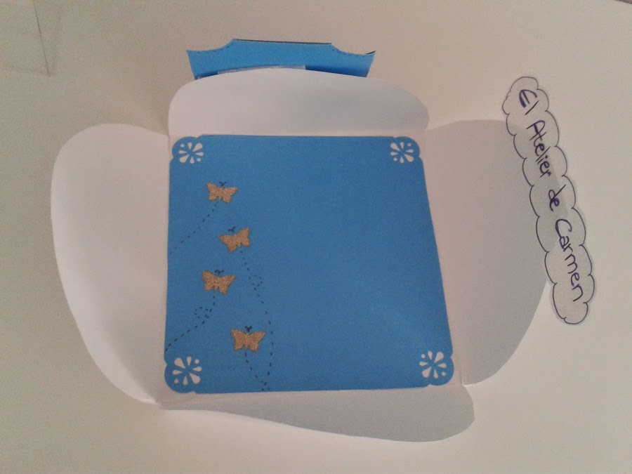 La tarjeta abierta, aqui en la parte central azul es donde va la dedicatoria.