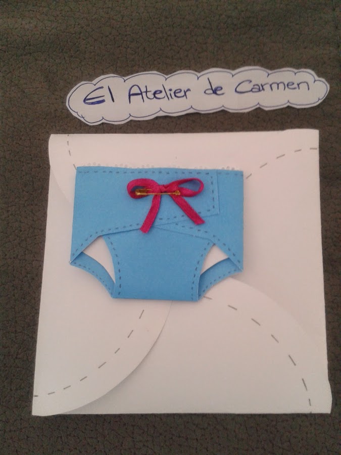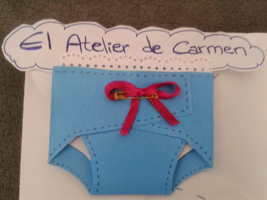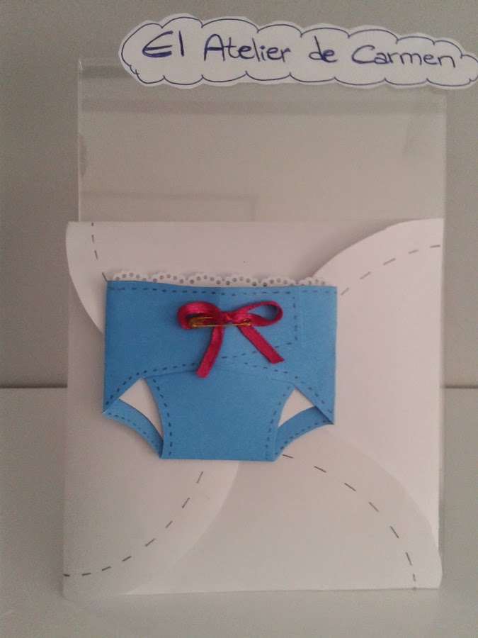 La tarjeta es una mezcla de dos tarjetas, he hecho una en cartulina blanca de un tamaño más grande y otra en cartulina azul, pero en tamaño mini, si se hace de un tamaño más grande la tarjeta con forma de pañal, puede servir por si sola. En esta ocasión he combinado las dos tarjetas en una.