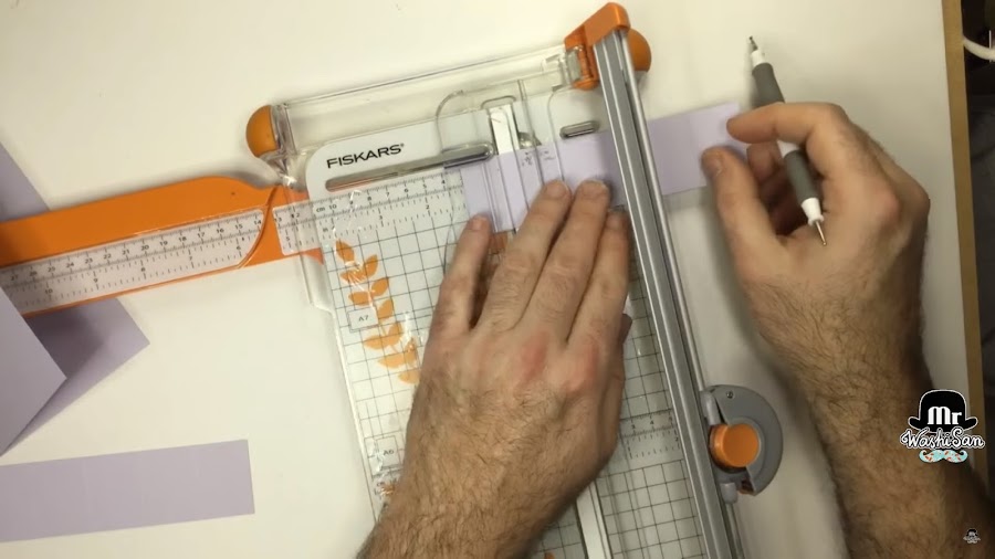 Primero preparamos la base con una cartulina de color malva. Cortamos una cartulina A4 por la mitad y doblamos una de las mitades por la mitad.