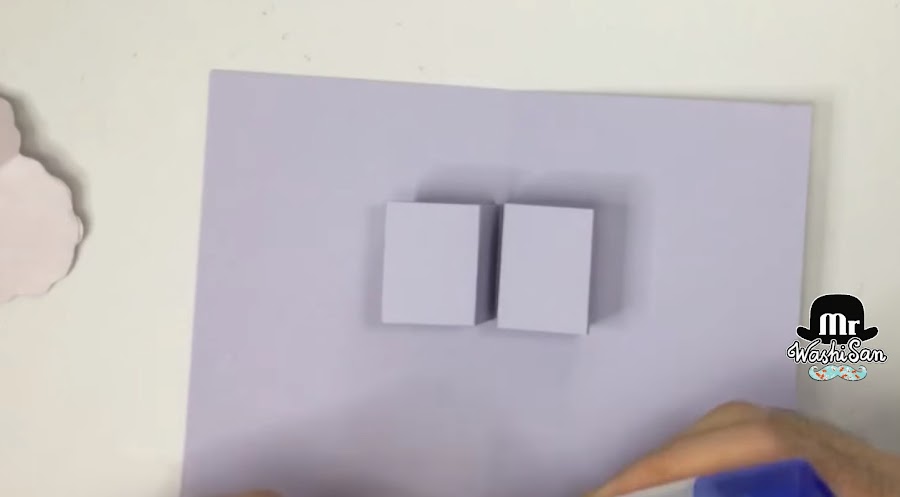 Simplemente hay que poner adhesivo en la parte superior de los dos cubos. De esta manera cuando se abre la tarjeta conseguimos que el corazón que hemos pegados tenga un efecto dimensional y sobresaldrá hacia el exterior.