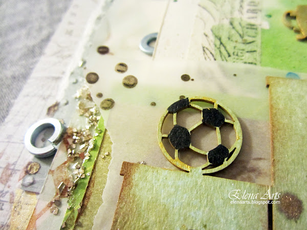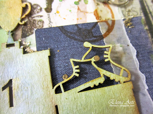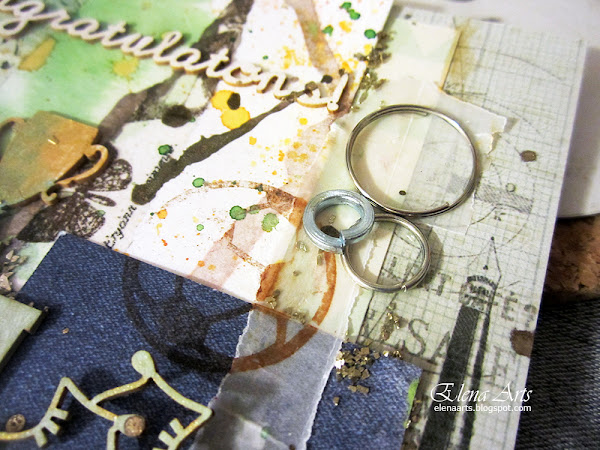 El fondo de papel es de Tim Holtz. También puse algunas capas de papel de seda, papel creado desde una hoja blanca, utilizando pintura en spray, sellos, salpicaduras, etc.