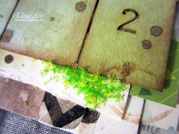 El chipboard está pintado con pintura en spray de color verde y teñido con la tinta vintage de Ranger.