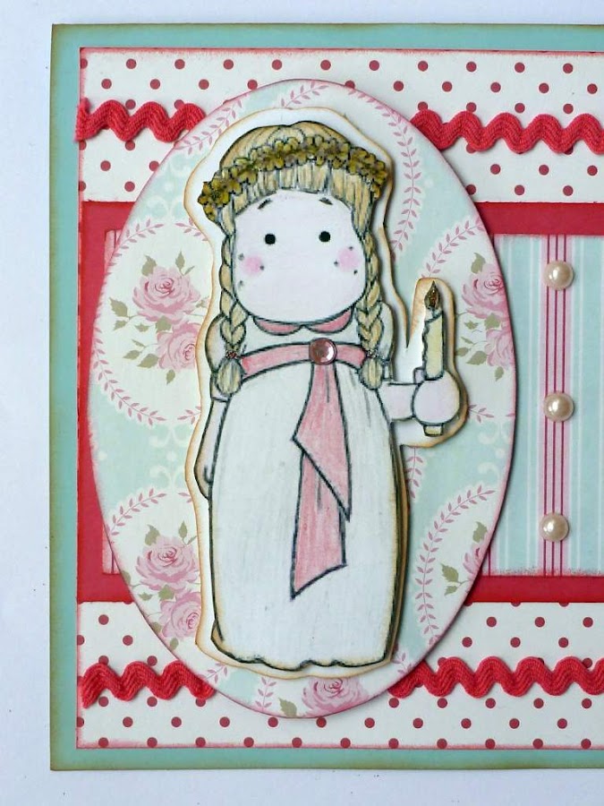 Hice una tarjeta muy de niña, con papeles Tilda y con una imagen de Magnolia muy dulce, pintada con pinturas de palo.