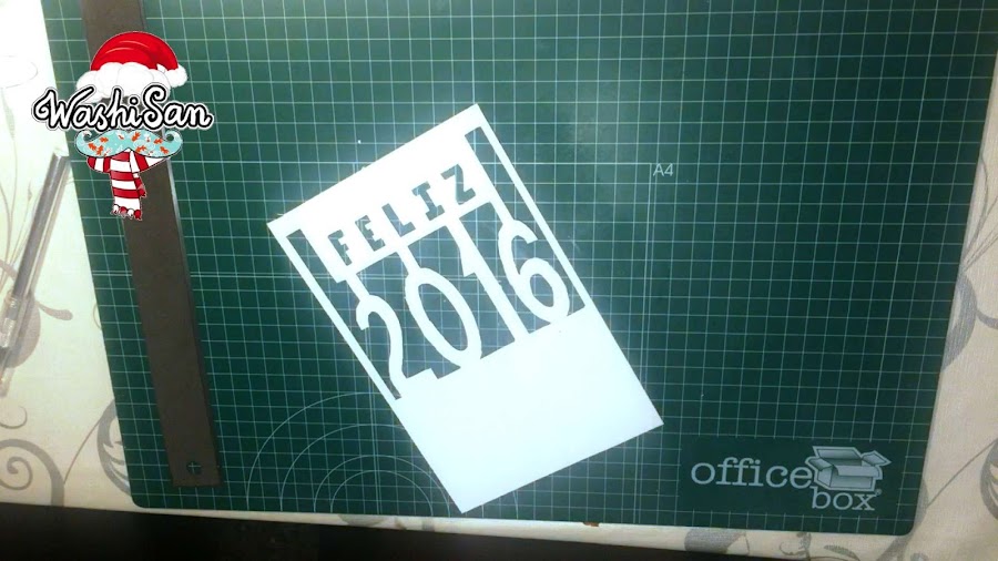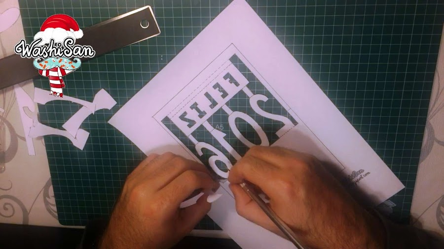 Y utilizando una base de corte y un cúter tenéis que recortar por las líneas de trazo continuo. Os recomiendo que empecéis recortando los espacios pequeños como las letras de feliz, ya que de esta manera es más difícil que se arrugue o se rasgue el papel.