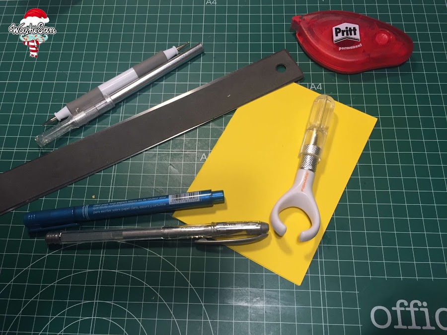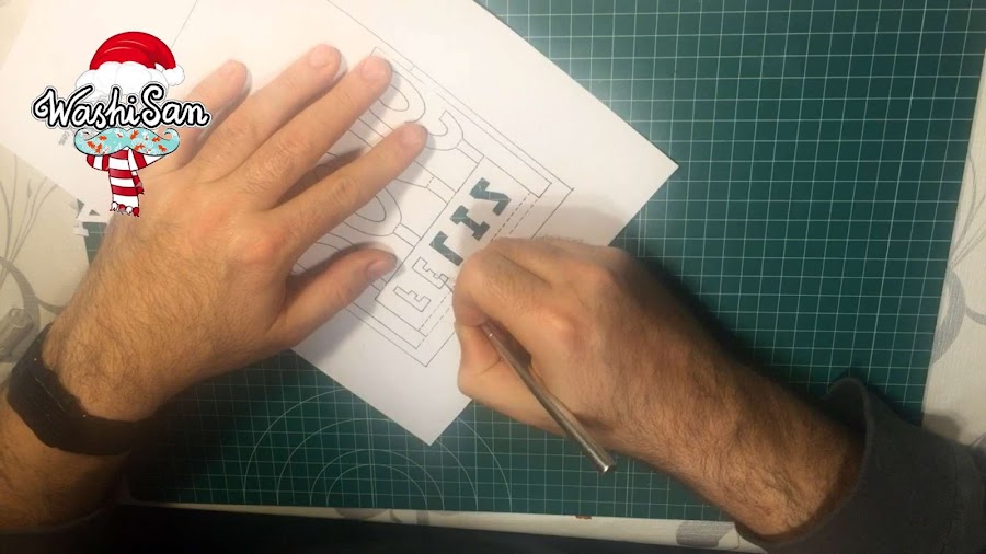 Lo primero que hay que hacer una vez impresa, es marcar las líneas que hay que doblar. Utilizaremos un buril repujador con el que tenéis que marcar las líneas de trazo discontinuo. Si no tenéis buril, podéis utilizar un lápiz portaminas sin la mina.