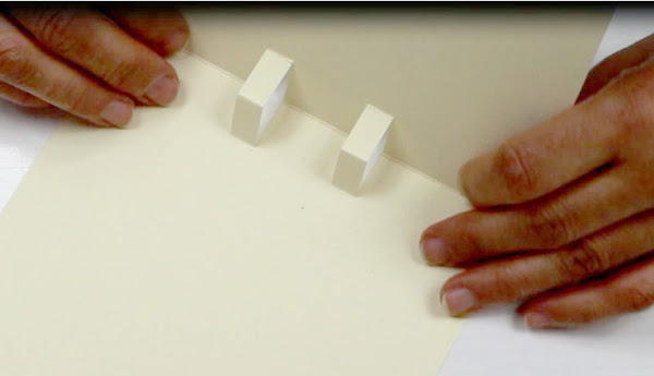 * Lo primero será cortar las pestañitas en las que pegaremos la cesta, para que de sensación de 3D * Vamo a hacer 2 pestañas, de 2 cm de largo, en el centro de la tarjeta, a 1 cm del medio cada una.