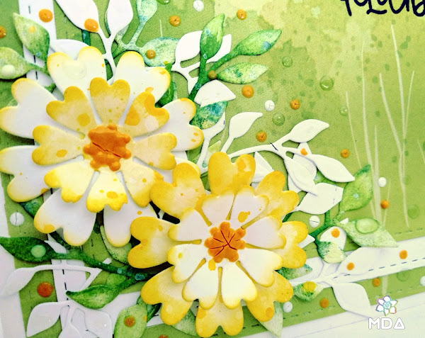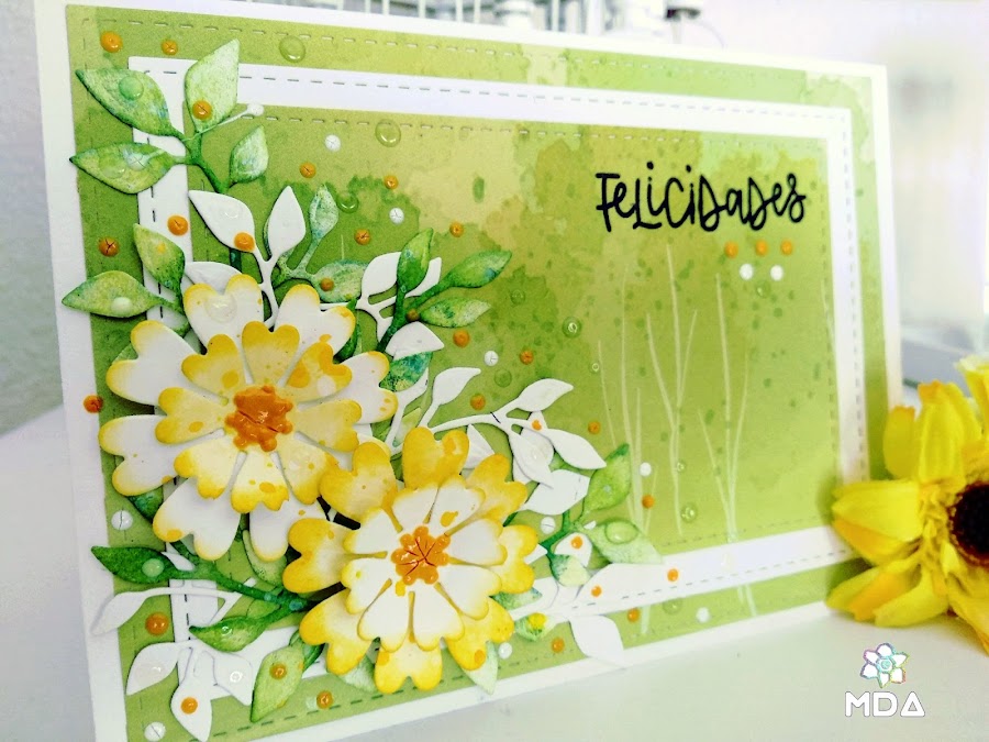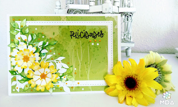 Desafiando al frío que tenemos por aquí, hoy os traigo una tarjeta muy primaveral realizada en tonos verdes y amarillo con la que participo en el 30º reto Desvaneo de Fábrica de Artesanía.