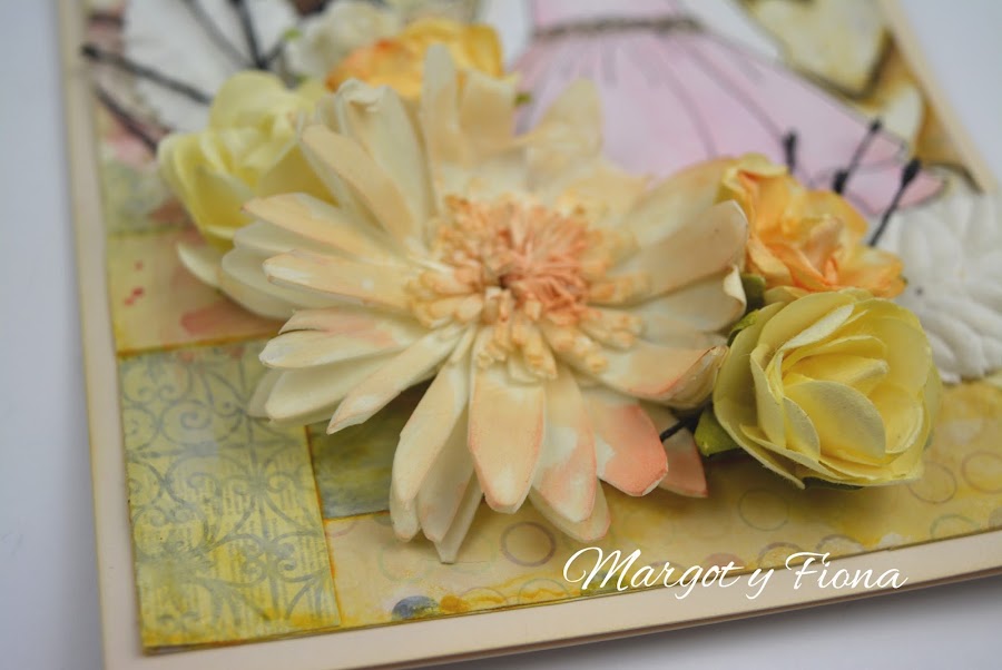En ella se han mezclado varias técnicas: mixed media, coloreo de sellos, y todo en tonos rosas y maranjas.