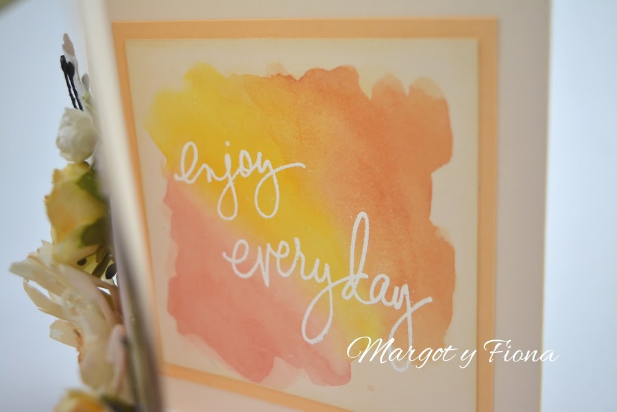 La leyenda interior está sellada y embosada en blanco , sobre un fondo de acuarela. Me gusta mucho el efecto que crea.