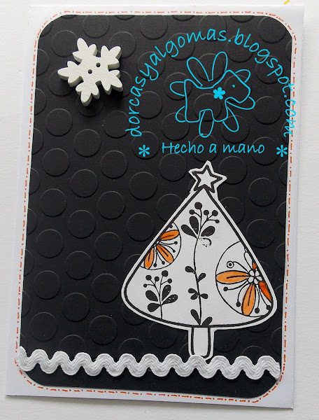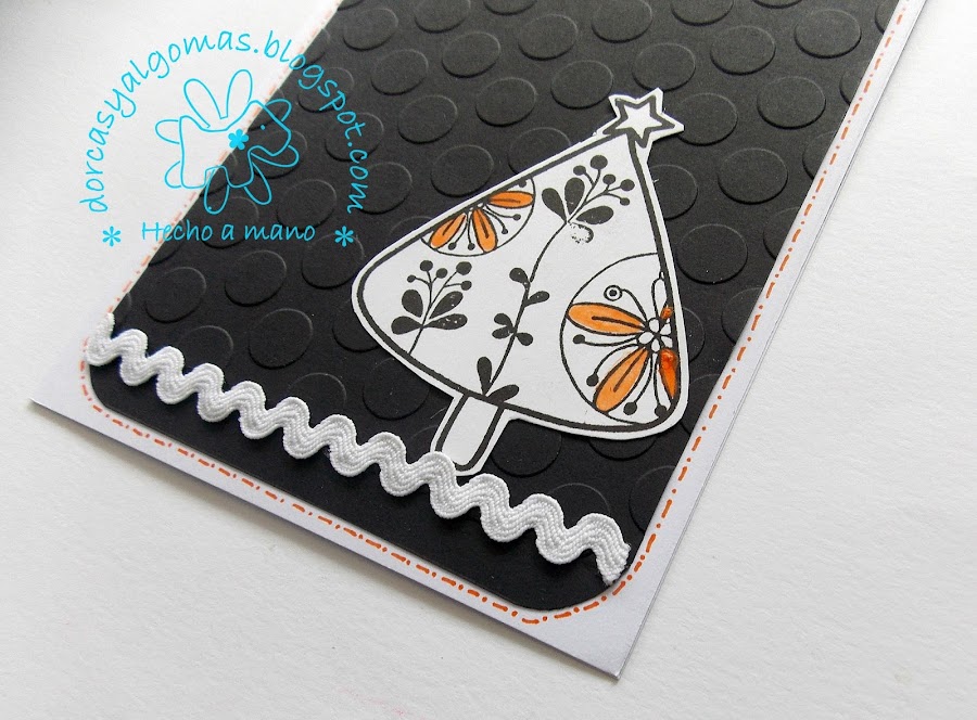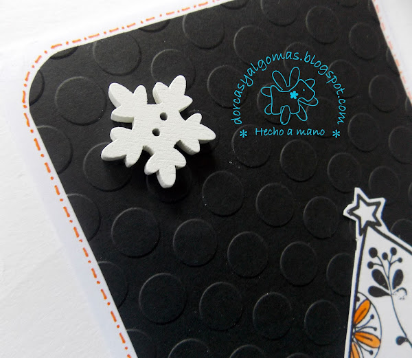 Os muestro una tarjeta de Navidad muy especial. Con ella participo en el reto de diciembre del grupo Scrapbooking Castilla y León , el tema es la Navidad pero lo que le hace especial es que no se pueden utilizar los colores típicos de la Navidad. Así que me he decantado por el blanco y el negro (los no colores) con un pequeño toque de naranja.