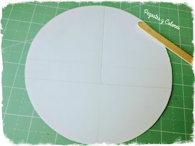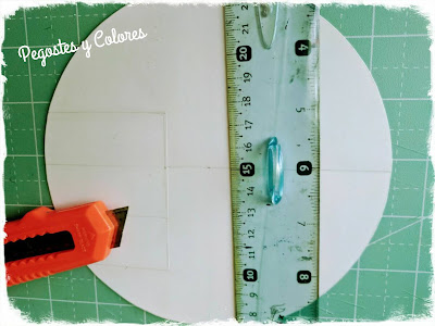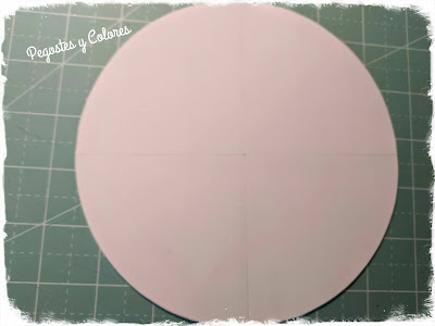 1.-Cortar un circulo, que puede ser del tamaño que tu quieras, en mi caso lo hice de 16 cm de diametro. Marcamos el centro y una linea que pase exactamente a la mitad, luego una linea perpendicular que pase por el centro (que forme un angulo de 90 grados).