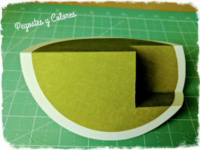 6.- Corte un circulo con un diámetro de 14 cm en un papel verde de scrapbooking, lo centro y pego sobre el blanco y lo doblo y le hago el mismo corte con el cuter.