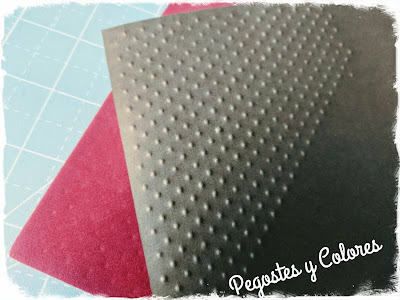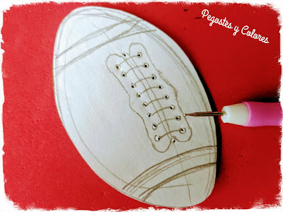 7.- Para hacer el balón de fútbol americano, coloque cartón café sobre una hoja de foamy y encima un estencil de puntitos. Esto lo hice porque yo no tengo maquina y placas para hacer embossing. Tome un bolillo para embossing (repujado) que tuviera el mismo diámetro de los orificios e hice presión en cada uno de ellos, para marcar suavemente sin romper. Esto lo hice solo en un segmento del cartón, calculando cuanto iba a necesitar para un balón.