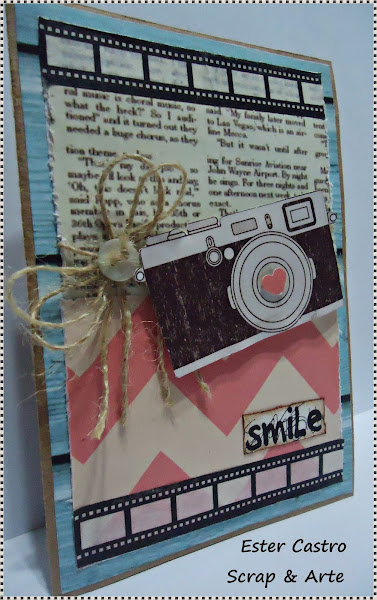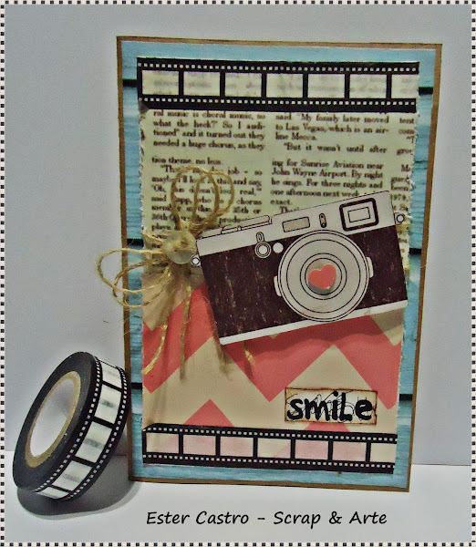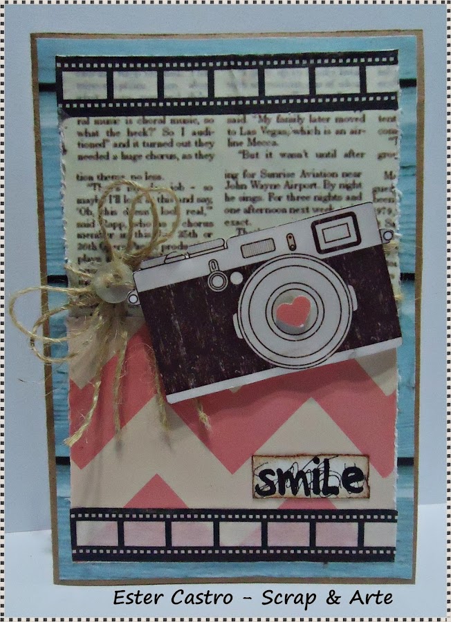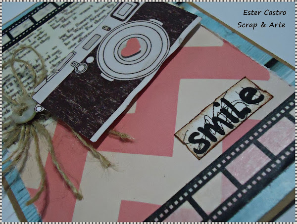 Y en el centro decore con una cámara de foto con volumen y un corazoncito en el centro del lente, hilo rústico con un moño y un botón. En la parte inferior un cartel con la inscripción Smile (sonrie)