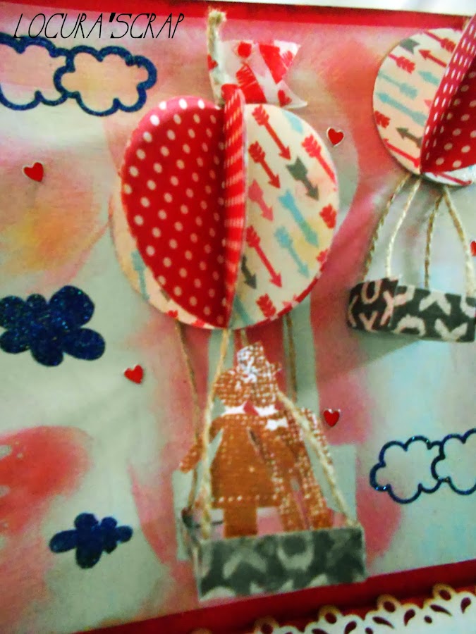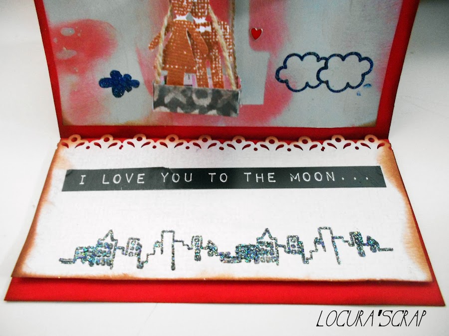 Como podéis ver esta hecha en 3D,con una base de apoyo. Hemos dado un color rojizo al fondo,con un toque de amarillo con tintas distress , los detalles de las nubes están hechos con sellos y con polvos embosing para que le diera un efecto mas bonito, el globo y la tarjeta en si, lo hicimos con papeles de la colección Head over heels by deena rutter de echo park paper , que nos encanto , la pareja del globo no es otra que la de los sellos de sal y pimienta.La parte de abajo las casitas son un sello de Amy tanguerine.