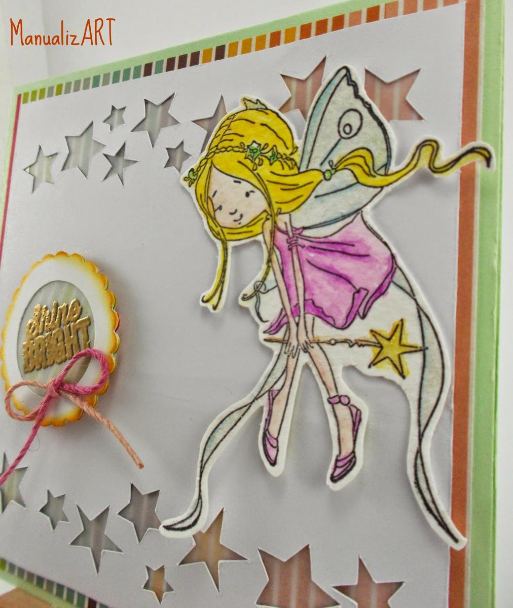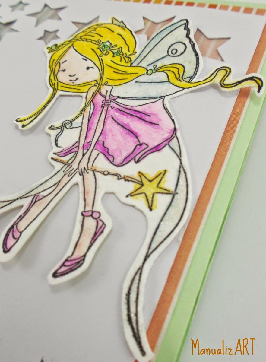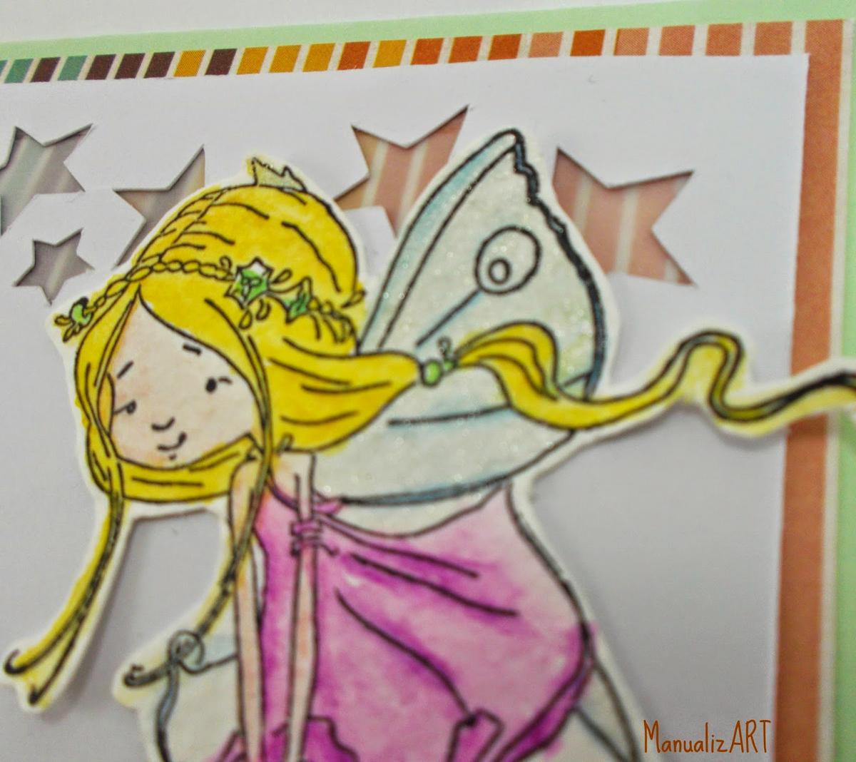 En un trozo de papel de acuarela, estampé un hada con tinta StazOn, para poder pintarla luego con lápices acuarelables. Luego la recorté, dejando un pequeño borde alrededor, y pinté las alas con mi Wink of Stella transparente. ¡Me encanta el efecto purpurina que le da!