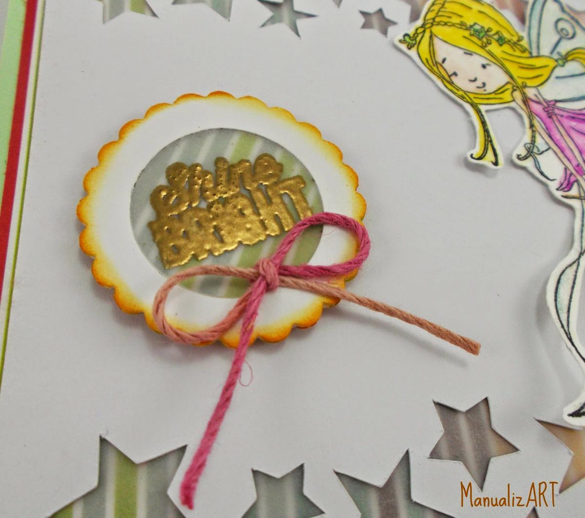 Por último, troquelé un círculo festoneado y le hice un agujero con un troquel de círculo para hacer una ventanita. En un trozo de papel vegetal, estampé con tinta Watermark y espolvoreé polvos de embossing dorados, que fundí con mi pistola de calor. Troquelé otro círculo festoneado del mismo papel estampado que había usado para el fondo, y lo coloqué de fondo del sentiment dorado.