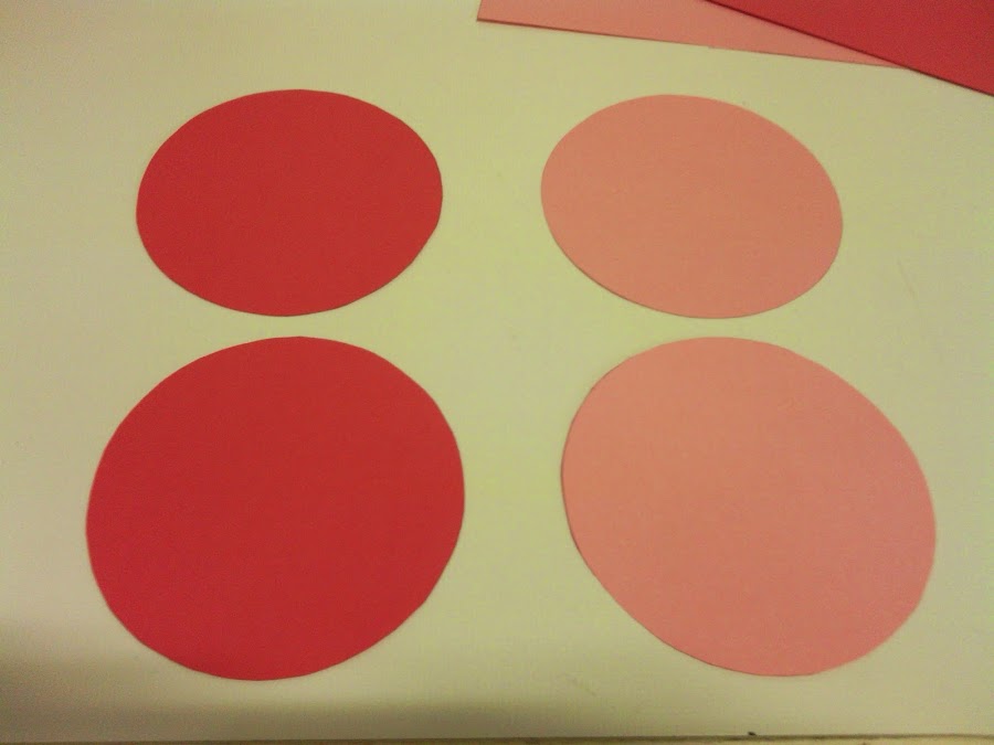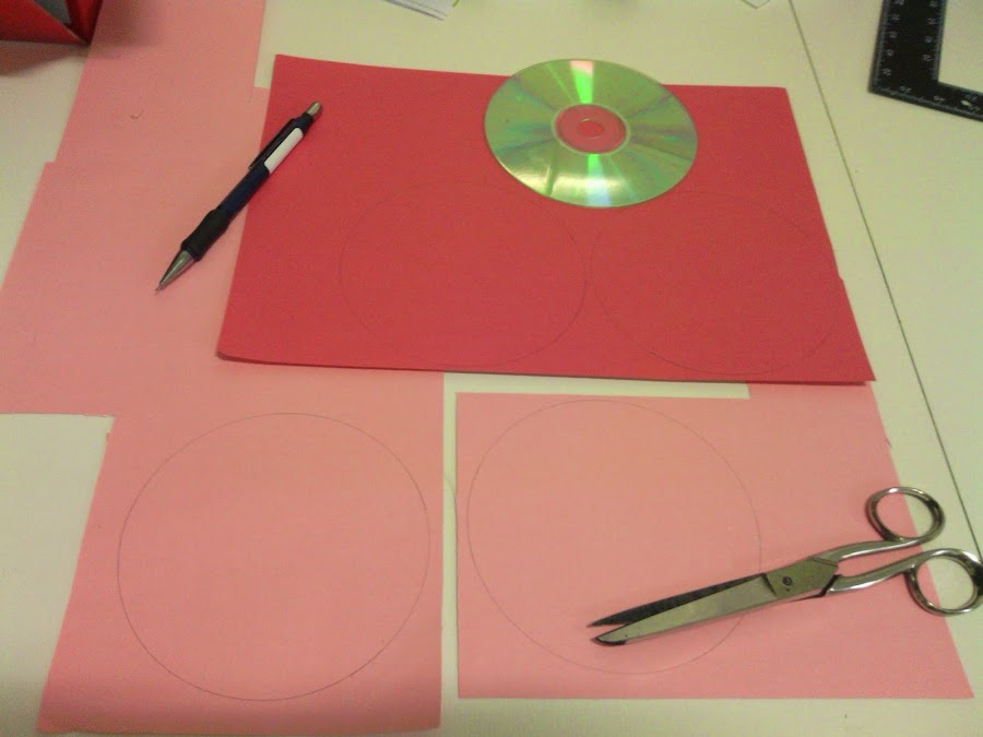 Tenéis que dibujar, utilizando como plantilla un CD, cuatro círculos en una cartulina. Yo en este caso he utilizado 2 de un color y 2 de otro.