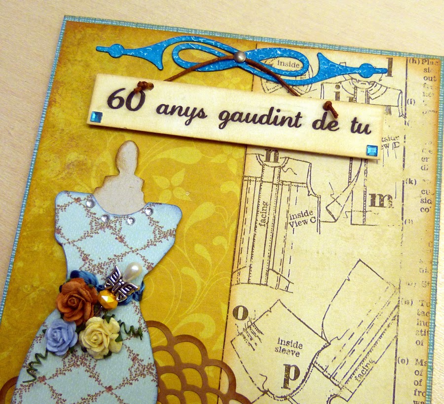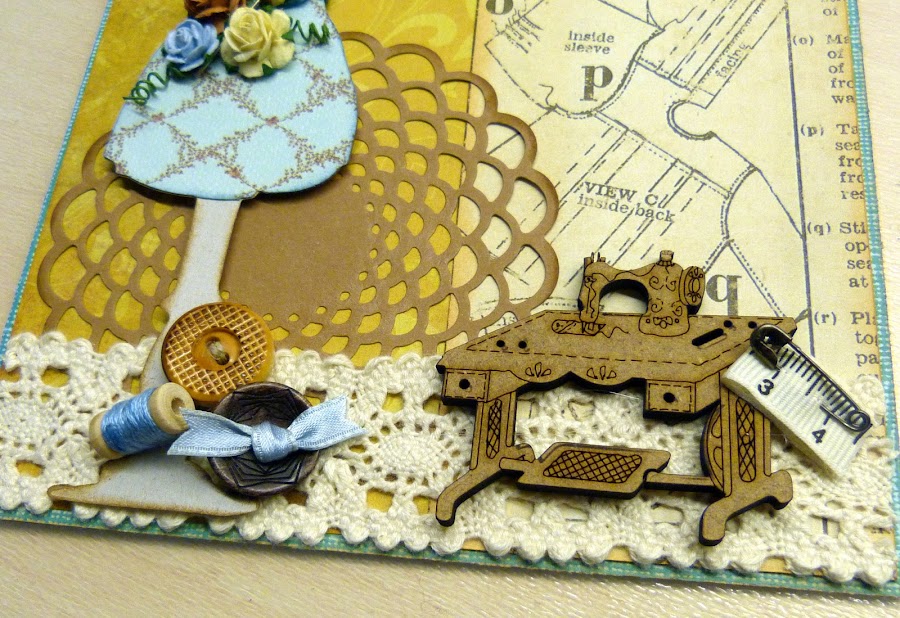 Los adornos principales son el troquel del maniquí de Tim Holtz y un gran botón de madera en forma de máquina de coser antigual.