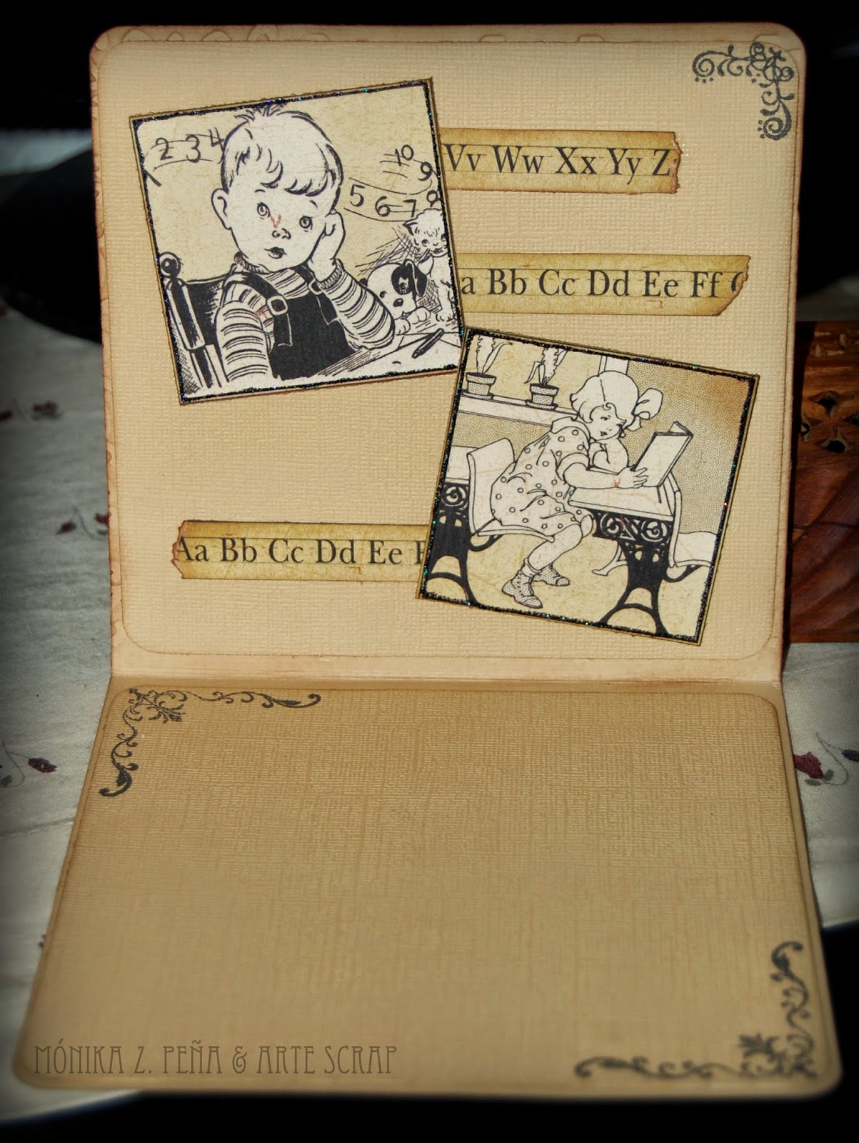 Recorté todo el papel de Graphic 45 y seleccioné las imágenes de niños estudiando para poner en el interior y la central para la portada.