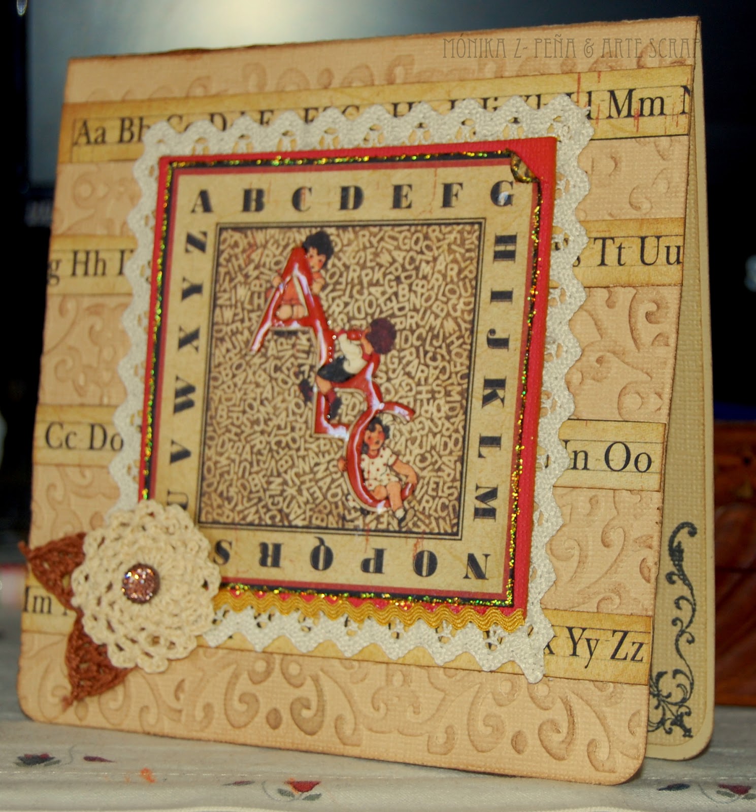 Con Glossy pegué unos trozos de puntilla y la flor de ganchillo. También repasé con el las letras ABC para darle relieve.