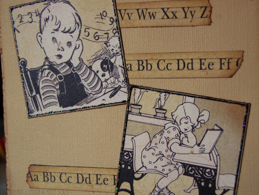 Recorté todo el papel de Graphic 45 y seleccioné las imágenes de niños estudiando para poner en el interior y la central para la portada.