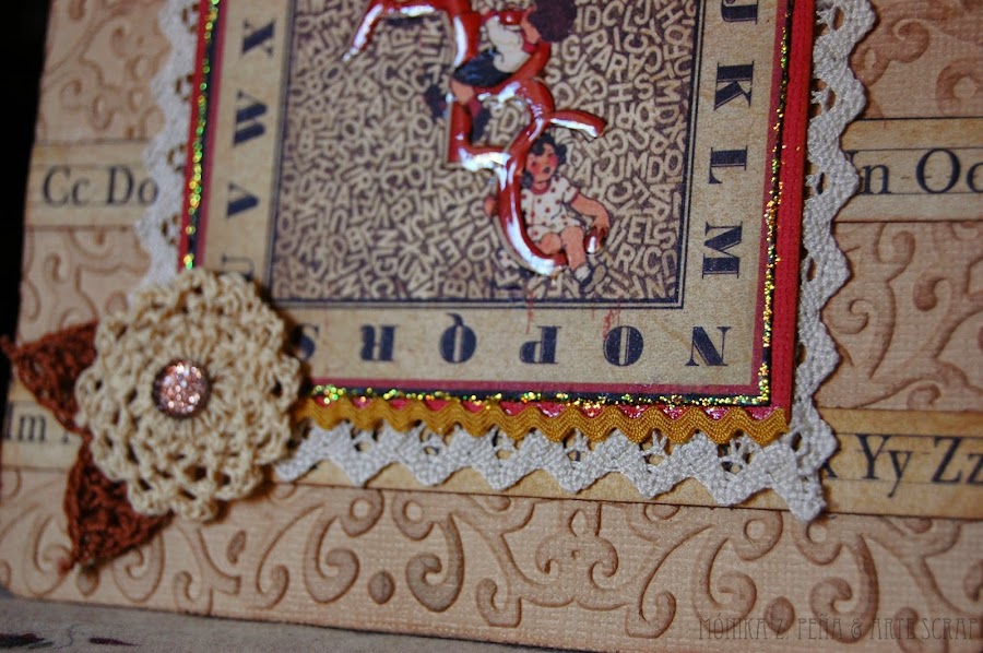 Con Glossy pegué unos trozos de puntilla y la flor de ganchillo. También repasé con el las letras ABC para darle relieve.