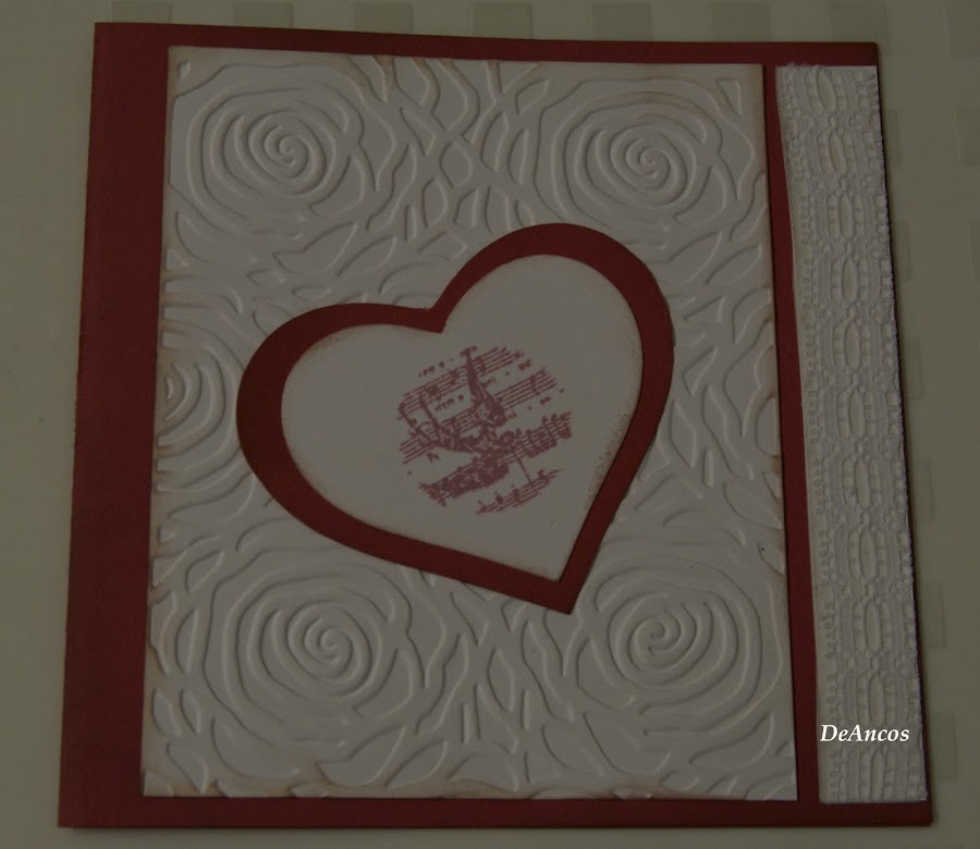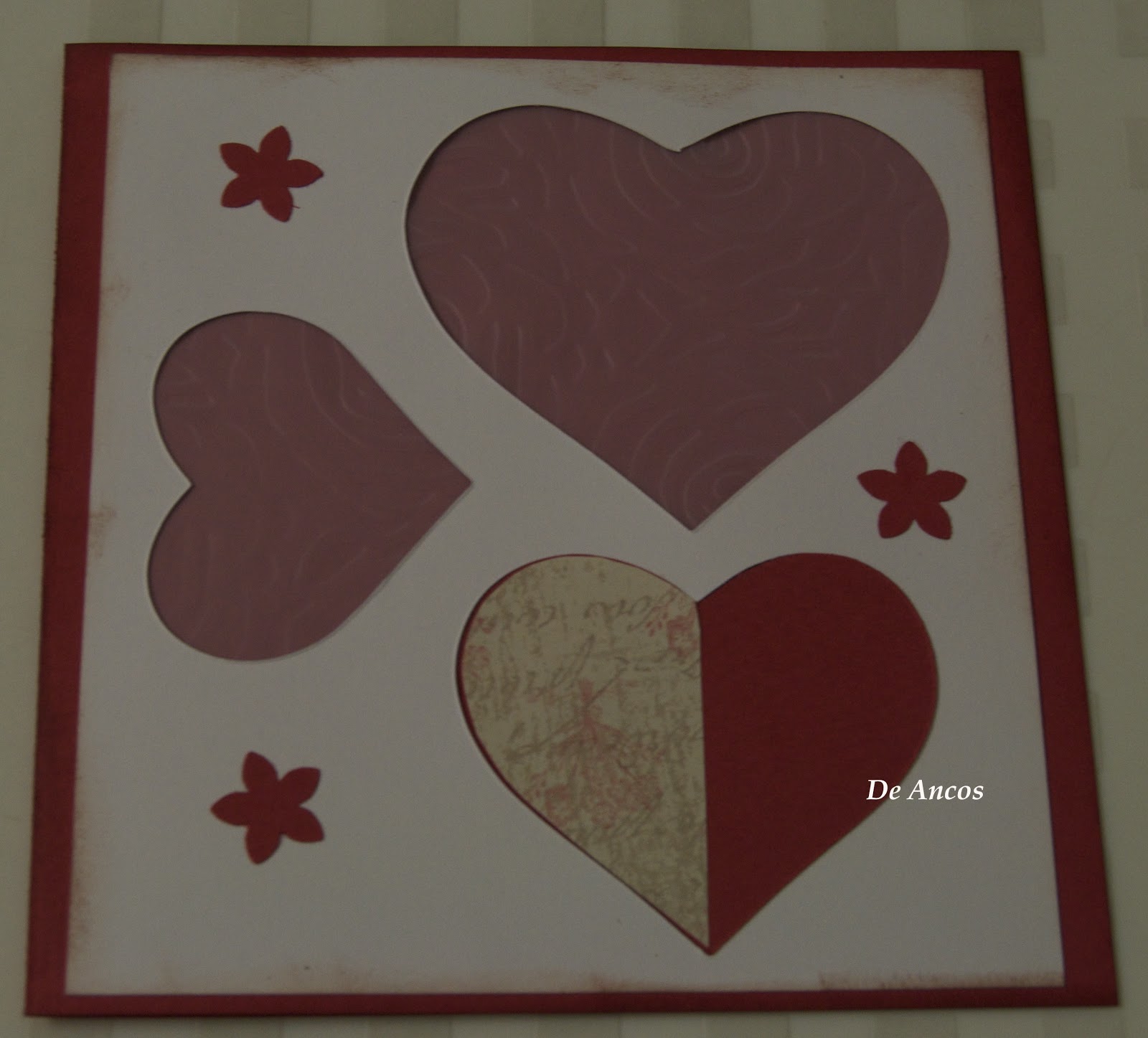 Se me ocurrió que ningún motivo mejor que un corazón para acompañar a las almohadas y, de varias maneras, puse uno en cada tarjeta: uno está embosado, otro con decoupage, otros con pergamano embosado (fue una prueba y me gustó el efecto) con un folder de rosas. No tienen más misterio. Espero que les gusten.