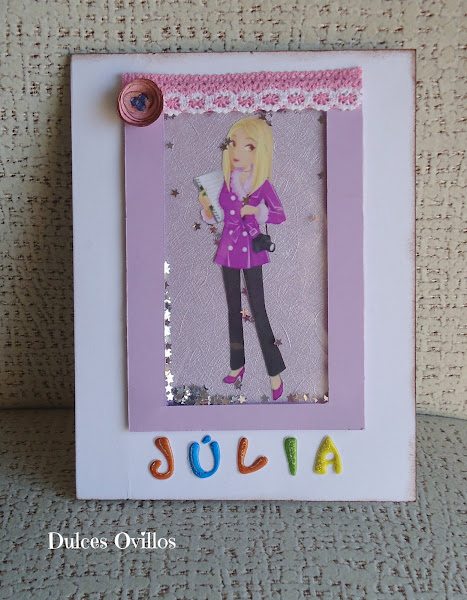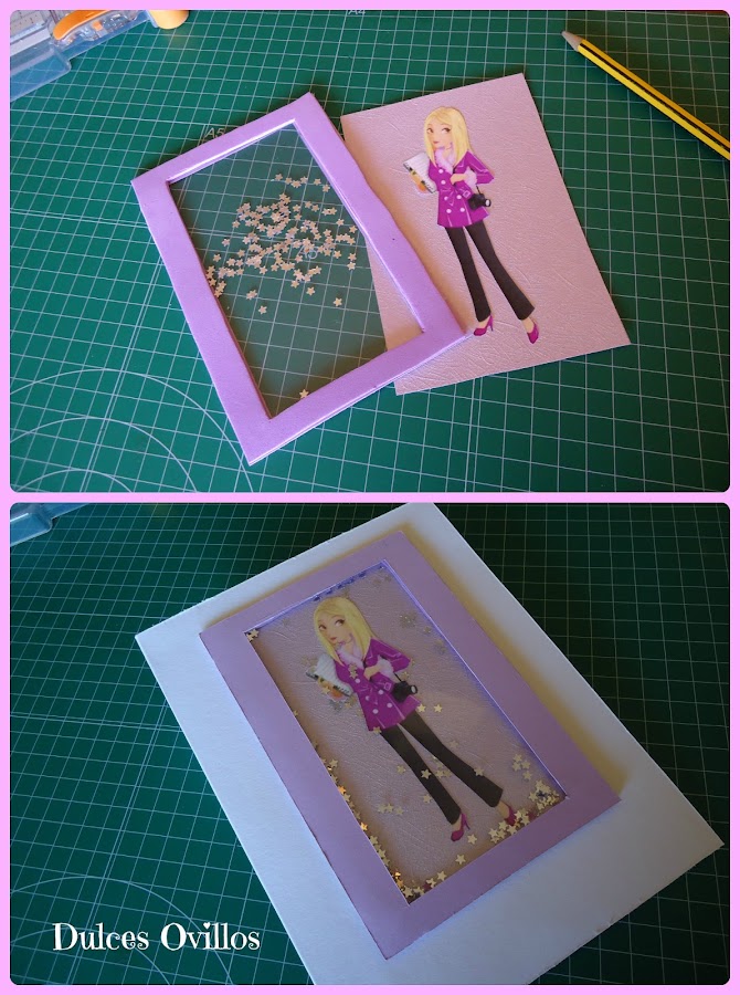 estrellitas flotantes entre el acetato y el papel fantasía.Luego además añadí una florecita, una puntilla y las letras con el nombre.