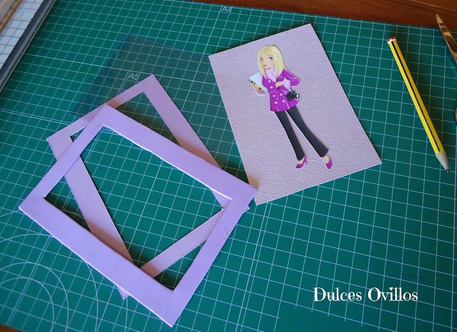 Una vez elegido el dibujo impreso, recorté a medida el papel fantasía que le haría de base, así como la goma Eva y la cartulina que enmarcan el trocito de acetato.