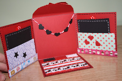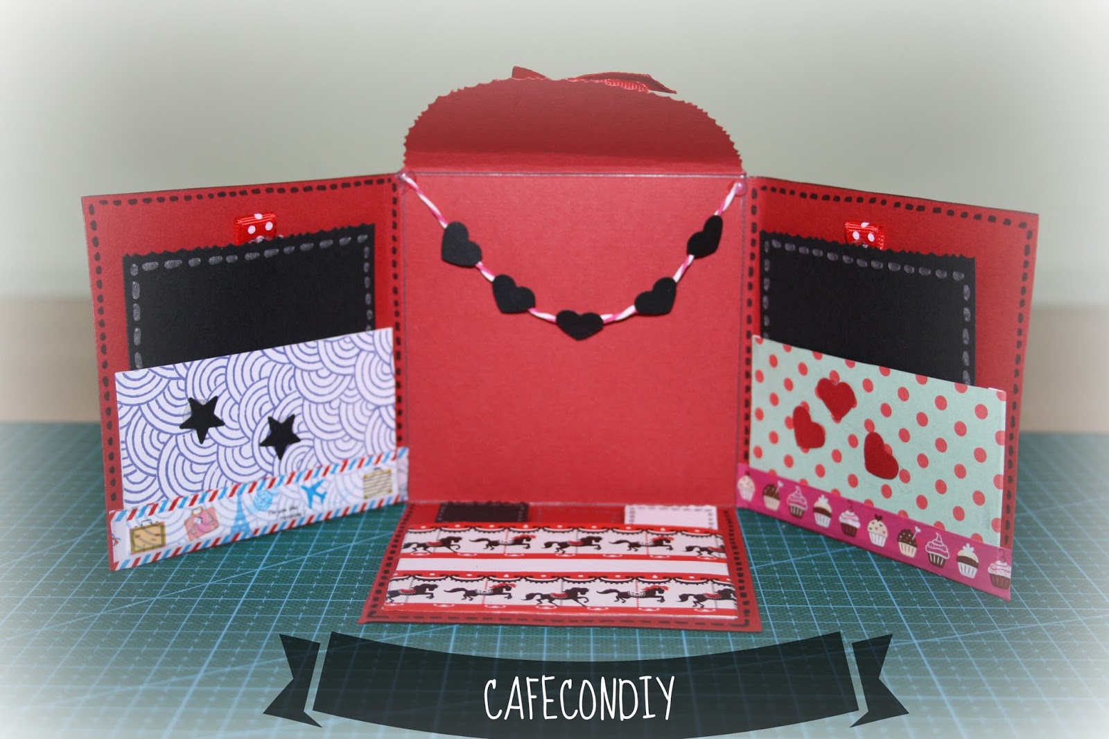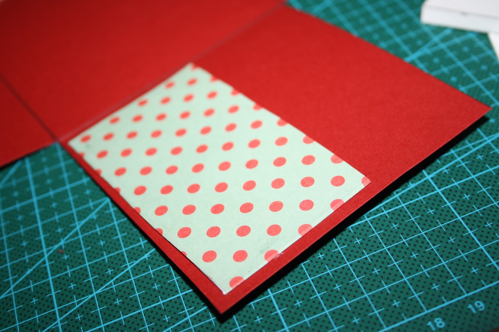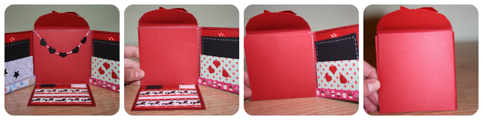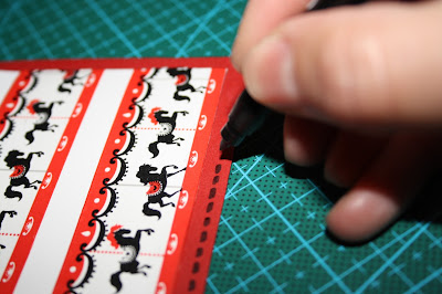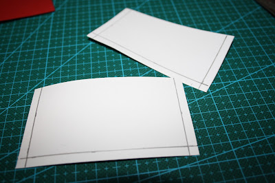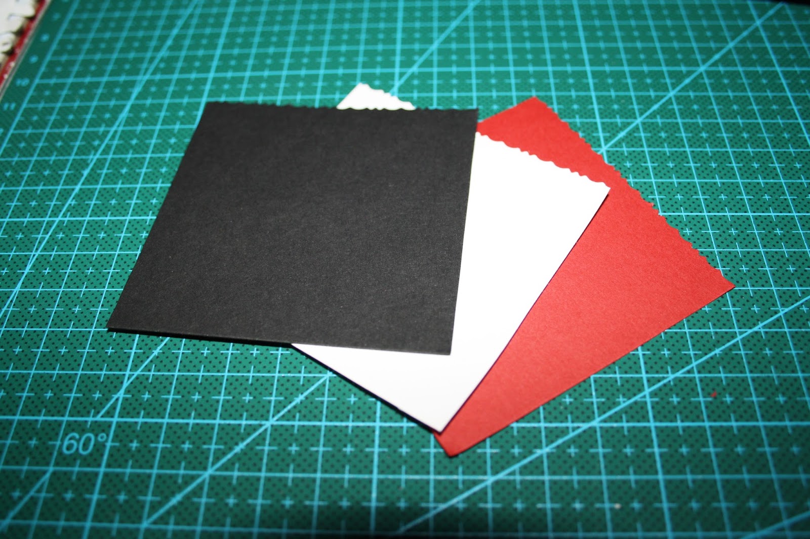 Haremos otros tres cuadrados de 7 x 7 cms. Esta vez he mezclado rojo, negro y blanco. Y a estos cuadrados les haremos una hendidura en la parte superior de 2,33 x 1,5 cms de profundidad. Las hendiduras quedarán correlativas.