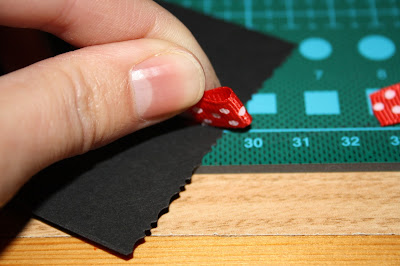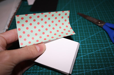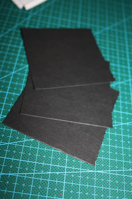 Volvemos a recortar cuadrados de cartulina negra de 7 x 7 cms. A estos les pegaremos con la silicona un pequeño lazo a modo de pestaña para extraer la cartulina.