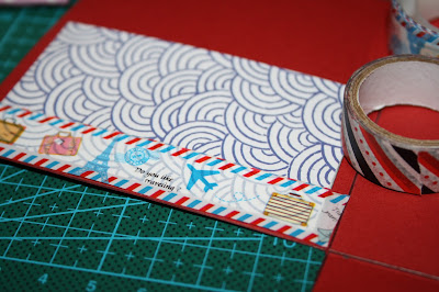 Recortamos un rectángulo de 9 x 6,5 cms; le hacemos unas pestañas de 0,5 cms, recortamos y decoramos con cinta washi tape.