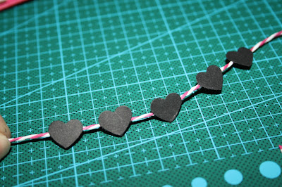 Troquelaremos corazones y los pegamos al hilo decorativo para simular una guirnalda.