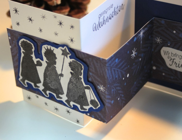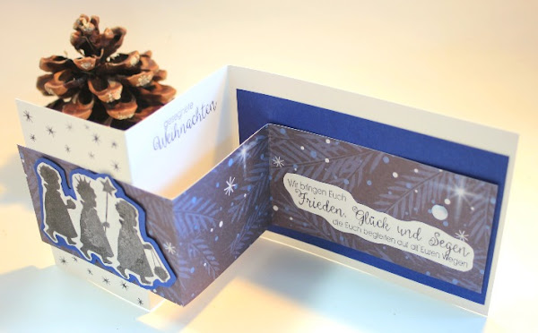 Los protagonistas son 3 niños disfrazados de reyes magos, que llegan con "paz, suerte y bendiciones" (lo dice la tarjeta también). Es que aquí en Alemania es costumbre que para el 6 de enero "te visiten los reyes magos" y son niños vestidos como Melchor, Gaspar y Baltasar, y algunos niños más que cantan, te piden una donación y bendicen tu casa y sus habitantes, colocan una señal (con tiza) en la puerta (supongo que así sólo te visita un grupo...) y es interesante porque eso que escriben se deja normalmente todo el año, ellos llegan lo borran y ponen el nuevo!Te colocan CMB más el año en curso más tres cruces. Algunos creen que las letras son las iniciales de los nombres de los reyes ( en alemán: Caspar, Melchior, Balthasar) pero en realidad es por una frase en latín: "Christus mansionem benedicat" Cristo bendiga esta casa