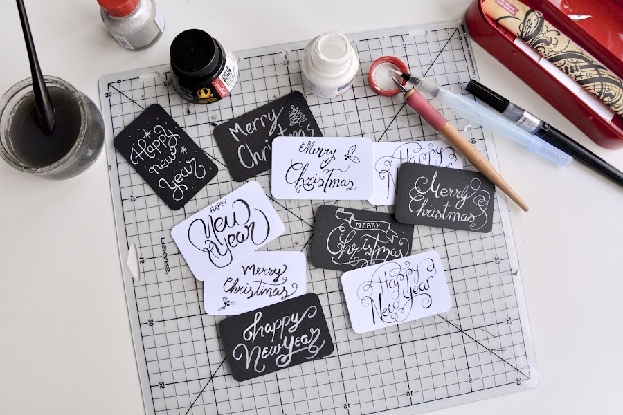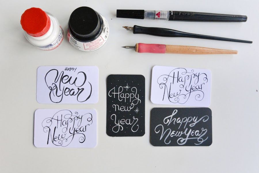 Como últimamente me ha dado fuerte con esto de la caligrafía, me pareció una buena oportunidad para practicar un poco. Algunas las he hecho con plumilla y otras con los pinceles de Pentel. La tinta blanca es de Winsor and Newton, especial para caligrafía, que la compré hace muy poco y tenía ganas de estrenarla. Había oído hablar muy bien de ella y la verdad que me ha encantado. Es muy cómoda de usar y muy opaca, queda muy bien.