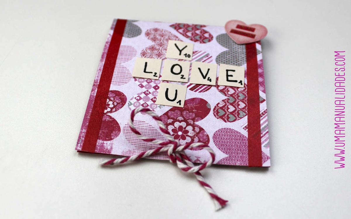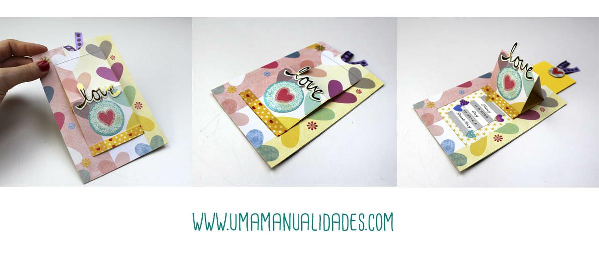 Ésta tarjeta, aunque parece muy complicada ¡No lo es! y la verdad es que queda de lo más llamativa. Cuenta con una estructura muy fácil de hacer que nos permite deslizar la pestaña hacia atrás descubriendo nuevos mensajes en la parte interior ¿No te parece genial?Éste tipo de tarjetas deslizantes, puede ser una solución muy original y divertida para regalar en San Valentín.