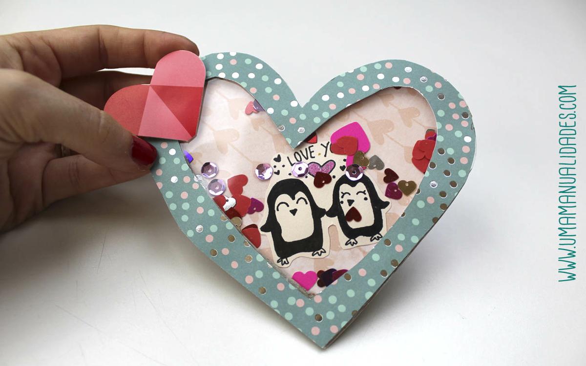 Otro tipo de tarjeta que siempre suele gustar y llamar mucho la atención son las shake cards. Podemos rellenarlas con un montón de lentejuelas y brillos de colores para un efecto más dinámico y original. Ésta en forma de corazón es ideal para San Valentín, en el interior podemos jugar con motivos románticos cómo éstos pingüinos enamorados y luego decorarla como más nos guste.