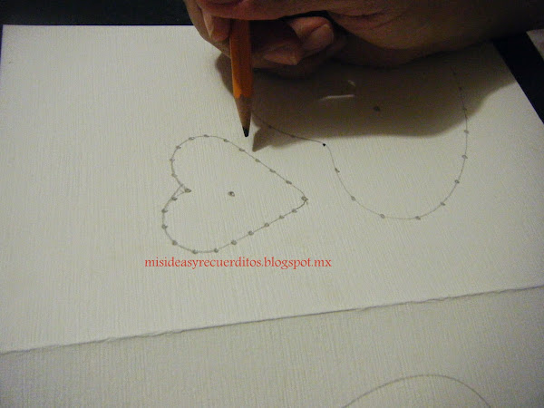 4. Con un lápiz dibuja un punto al centro del corazón y alrededor de todo el corazón dejando espacios entre cada uno y luego con el aguja de canevá perfora el centro del corazón y realiza pequeñas perforaciones en esos puntos.