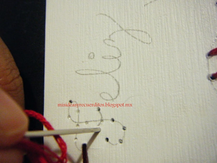 1. Perfora con cuidado cada letra y empieza a bordar. Con el papel es delicado, los puntos tienen que estar suficientemente separados o se puede perforar el papel.