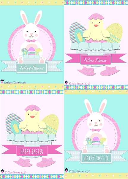 Y para ponéroslo todavía más fácil, si pincháis en la imagen inferior os podréis descargar las tarjetas de felicitación en formato .pdf listas para imprimir en tamaño A4 con papel de gramaje alto, doblar por la mitad y felicitar la Pascua o utilizar como invitación para fiestas de decoración de huevos de Pascua, búsqueda de huevos de Pascua para los peques o? para lo que queráis.