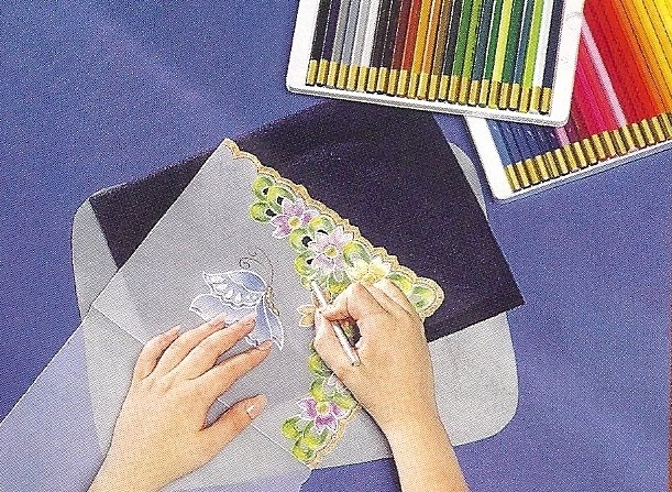 Con lapices policromos con lapices acuarelas colorear las cintas en verde esmeralda y verde pálido y la flores en dos tonos cada una como se relaciona seguidamente: mora y lavandra, rosa y rosa claro, azul celeste y azul frío, naranja y melocotón, amarillo anaranjado y crema. Usar los colores naranja, verde olivo y amarillo limón para los corazones, ocre tostado y amarillo ocre para el tallo. Pintar las alas de la mariposa en tres tonos de azul y el cuerpo en siena y melocotón. Después de dar color anaranjado a la orilla, hacerle rayitas por el revés en todo el contorno, remarcarlas luego por el derecho con rotulador, adquiriendo así la apariencia de bordado.