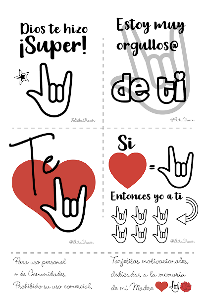 Lindas tarjetitas motivacionales, ideales para detalles de regalo, sorpresas , para la lonchera de los chicos , actividades y más. El motivo del diseño es el emoji de la "seña o signo" I love you, de La Lengua de Señas que utilizan las Personas Sordas